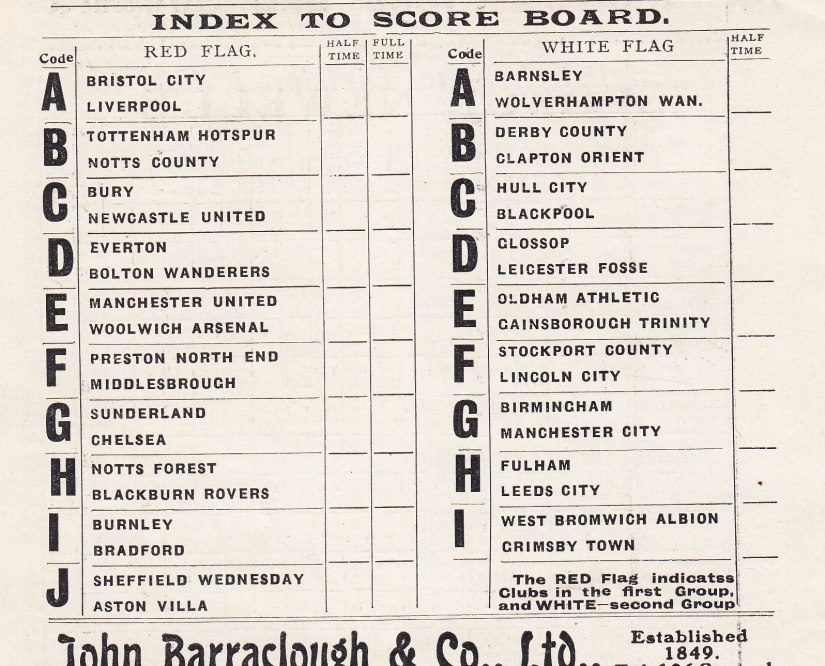 Historically however the programme was the means by which a supporter could comprehend the code to discover half-time progress elsewhere. The scores were displayed on a scoreboard at the top of the Kop with two showings, ‘red flag’ and ‘white flag’ respectively. In 1968 a tea bar was built into the scoreboard which was expanded for a single showing only and used for that purpose until 1978.
